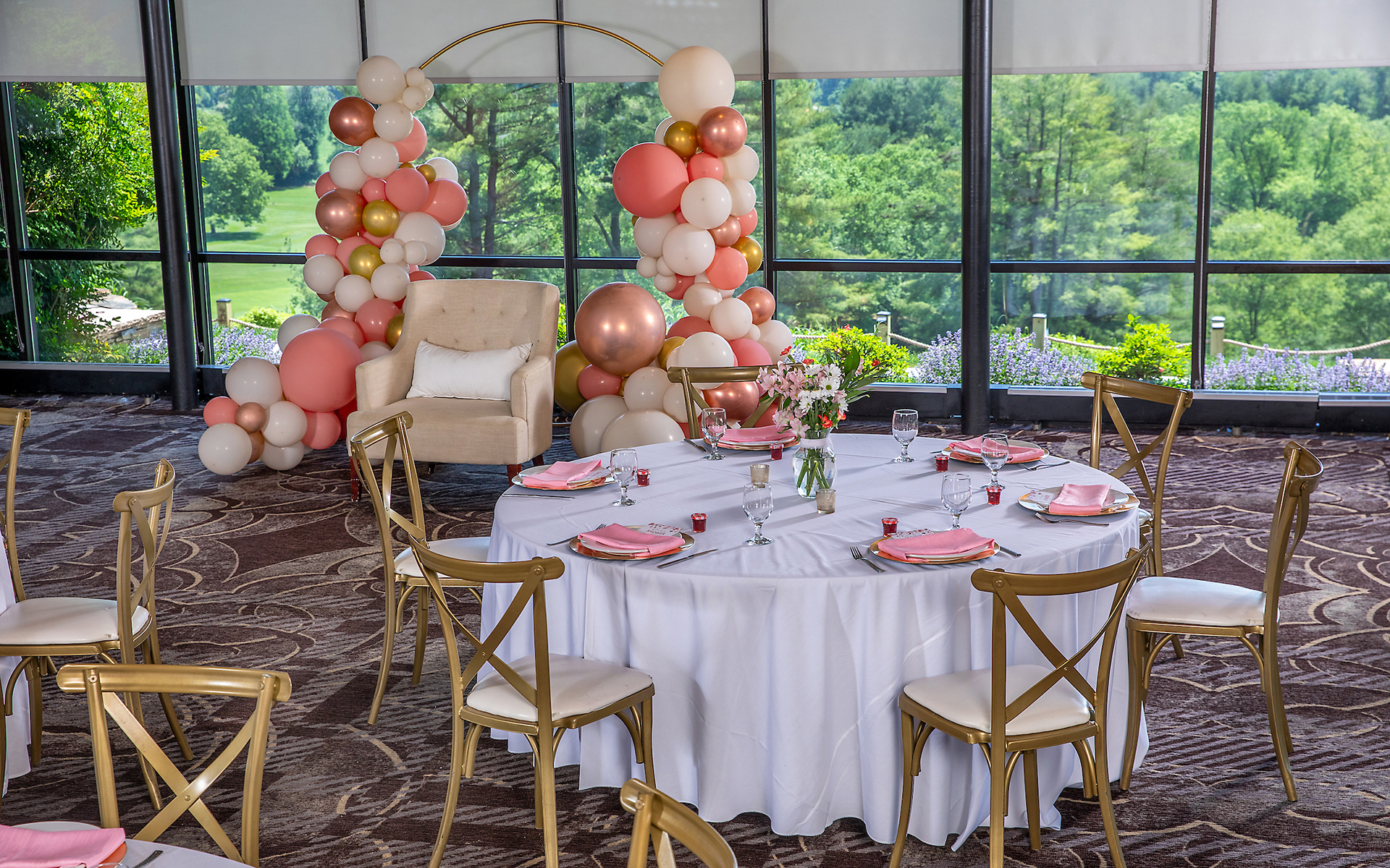 The beautifully updated Ballroom accommodates up to 180 guests with a 750-square-foot dance floor and a patio that showcases views of the Towson skyline and Loch Raven Reservoir.